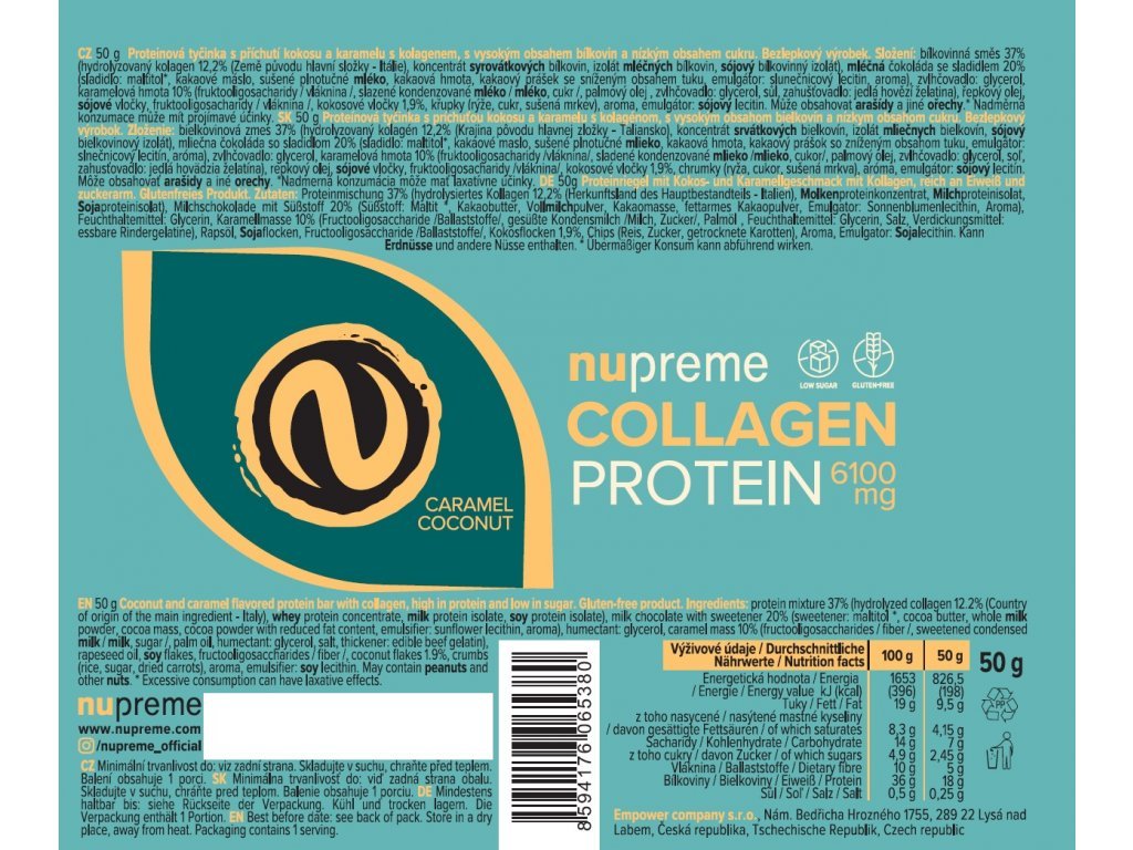 Kolagenová tyčinka Nupreme v sobě spojuje opravdu lahodnou chuť kokosu a karamelu s voňavou a chutnou čokoládou. Jedna tyčinka obsahuje 18 g proteinu, z toho více než 6 g tvoří špičkové peptidy kolagenu pro správný beauty efekt. Je navržena tak, aby byla každodenním občerstvením, které potěší chuťové pohárky, dodá energii a poskytne velkou škálu funkčních výhod. To vše při pouhých 2,5 g cukru v jedné tyčince. Kdo chce být ztracen, ať ochutná :-)